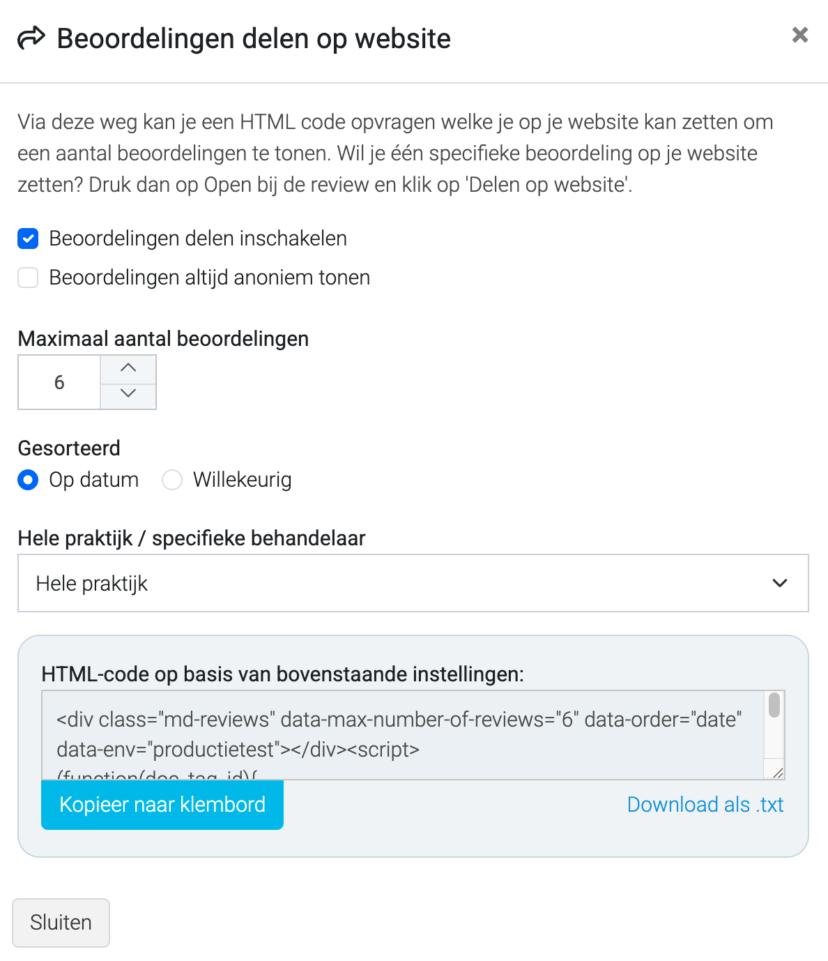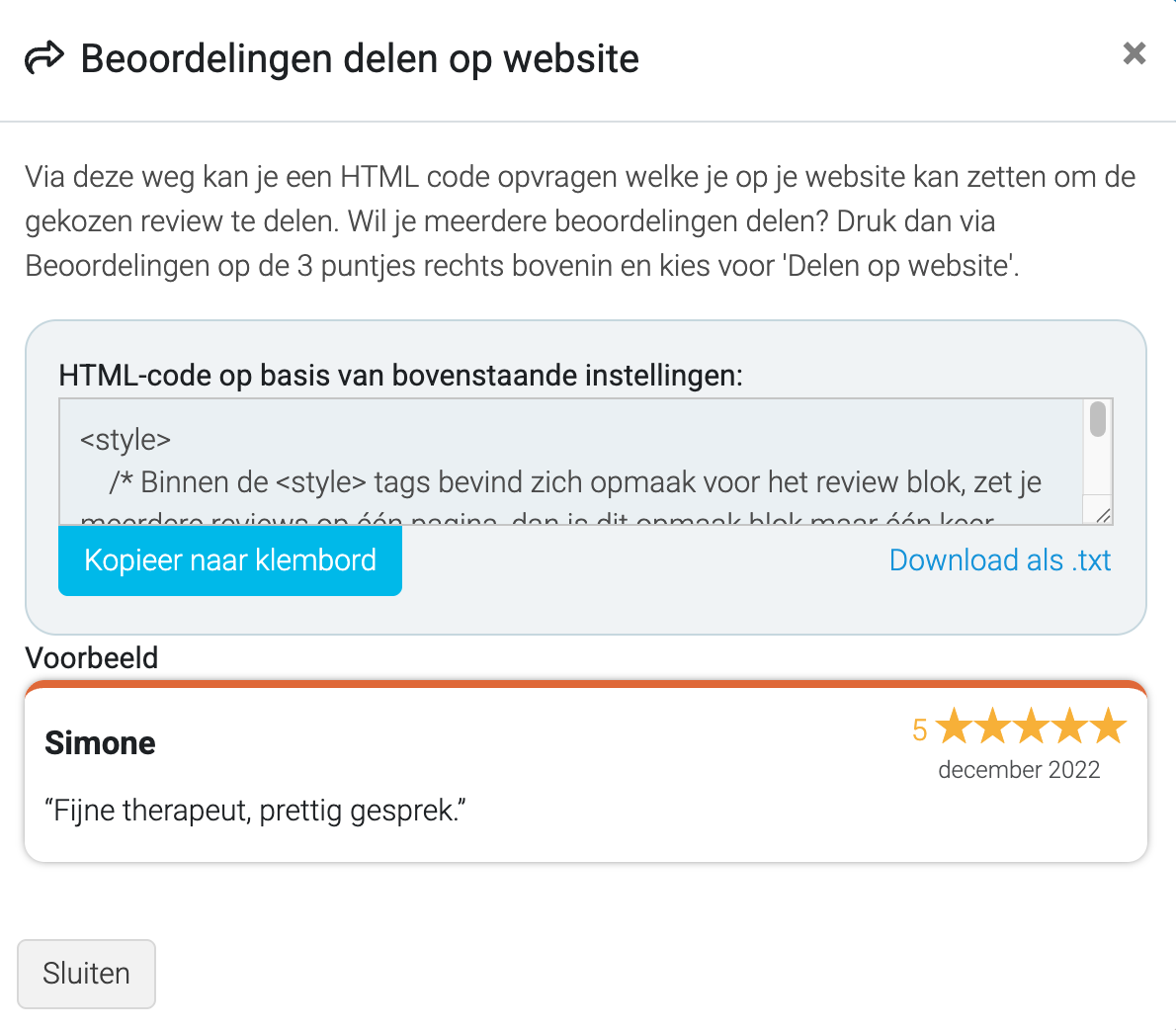De beoordelingen waarbij de cliënten aangeven dat deze gedeeld mogen worden op de website kun je eenvoudig toevoegen op je website.