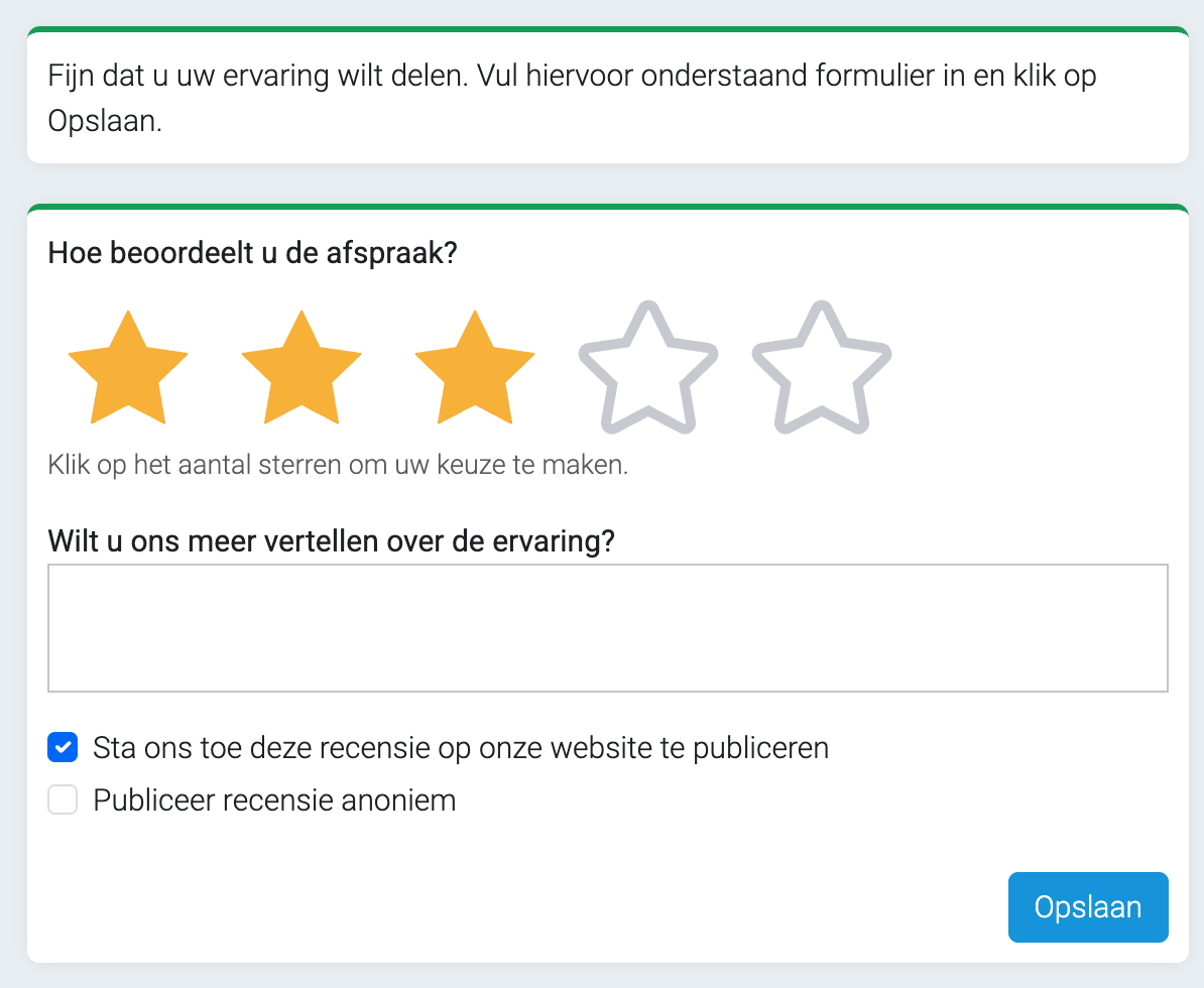 Je kunt per afspraaktype instellen of er een beoordelingsverzoek verstuurd moet worden. Tevens kan er per afspraaktype een andere inhoud van het verzoek ingesteld worden.