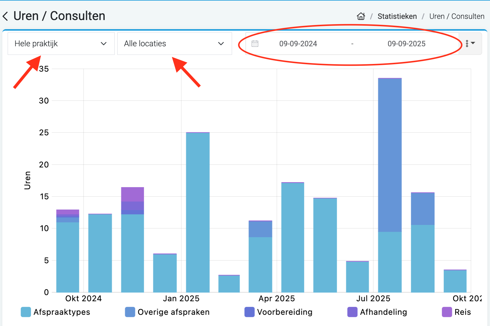- Bij de categorie Uren / Consulten kun je linksboven statistieken opvragen per behandelaar of locatie: