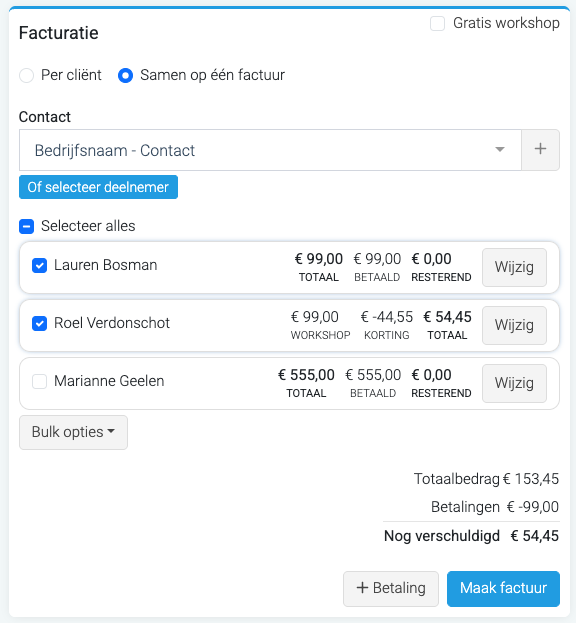 - Selecteer de deelnemers voor wie de workshop aan het contact gefactureerd moet worden.