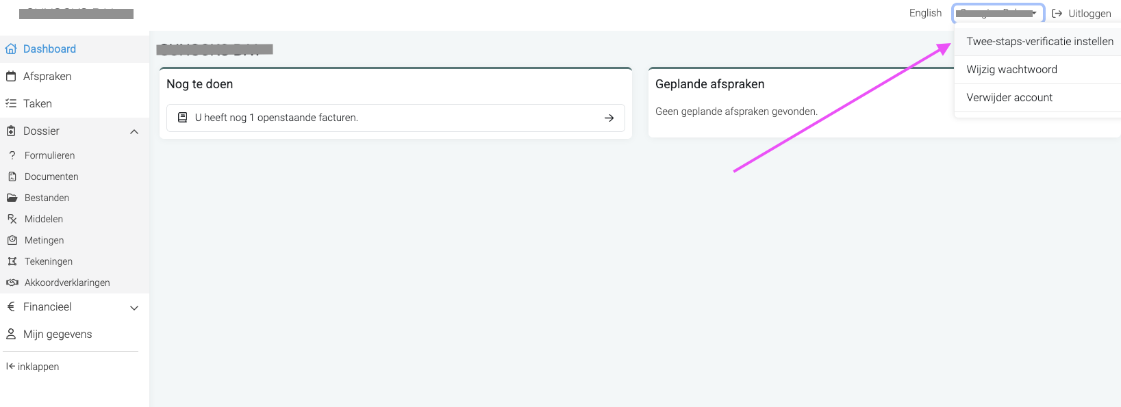 Een cliënt kan twee-staps-verificatie instellen in de cliëntomgeving door daar in te loggen en vervolgens op de gebruikersnaam bovenaan te klikken:
