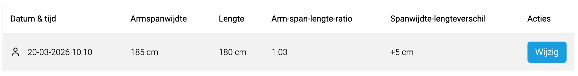 De arm‑span‑lengte‑ratio wordt nu berekend door de armspanwijdte te delen door de lengte. Het spanwijdte‑lengteverschil wordt berekend door de armspanwijdte min de lengte te doen.