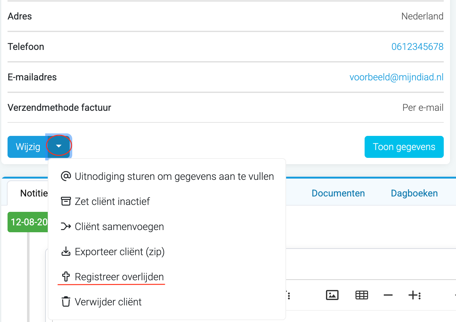 Bij het overlijden van een cliënt kun je dit registreren in het dossier. Na registratie wordt de cliënt op inactief gezet, kunnen dossiergegevens niet meer worden aangepast en worden er geen e‑mails meer naar de cliënt verstuurd.